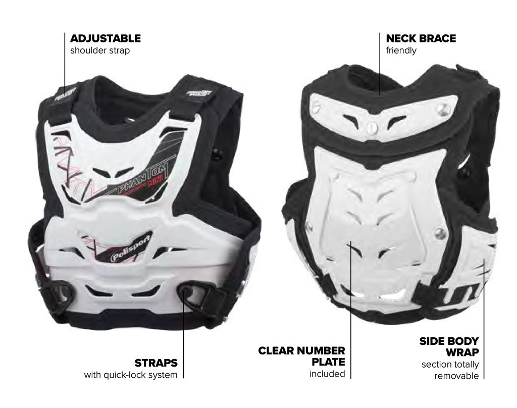 Phantom Mini je extrémně lehký a pohodlný chránič hrudníku speciálně navržený pro děti, pro které chcete nejvyšší stupeň bezpečnosti. Chrániče jsou CE certifikované (EN 1621-3). Poskytne naprostou svobodu pohybu, skvělé odvětrání a pohodlí při jízdě. Kromě toho má Phantom Mini boční chránič žeber, který je zcela odnímatelný, což umožňuje chránič individuálně přizpůsobit pro maximální pohodlí. Phantom Mini lze nosit pod nebo přes MX dresy a je kompatibilní s chrániči krční páteře.